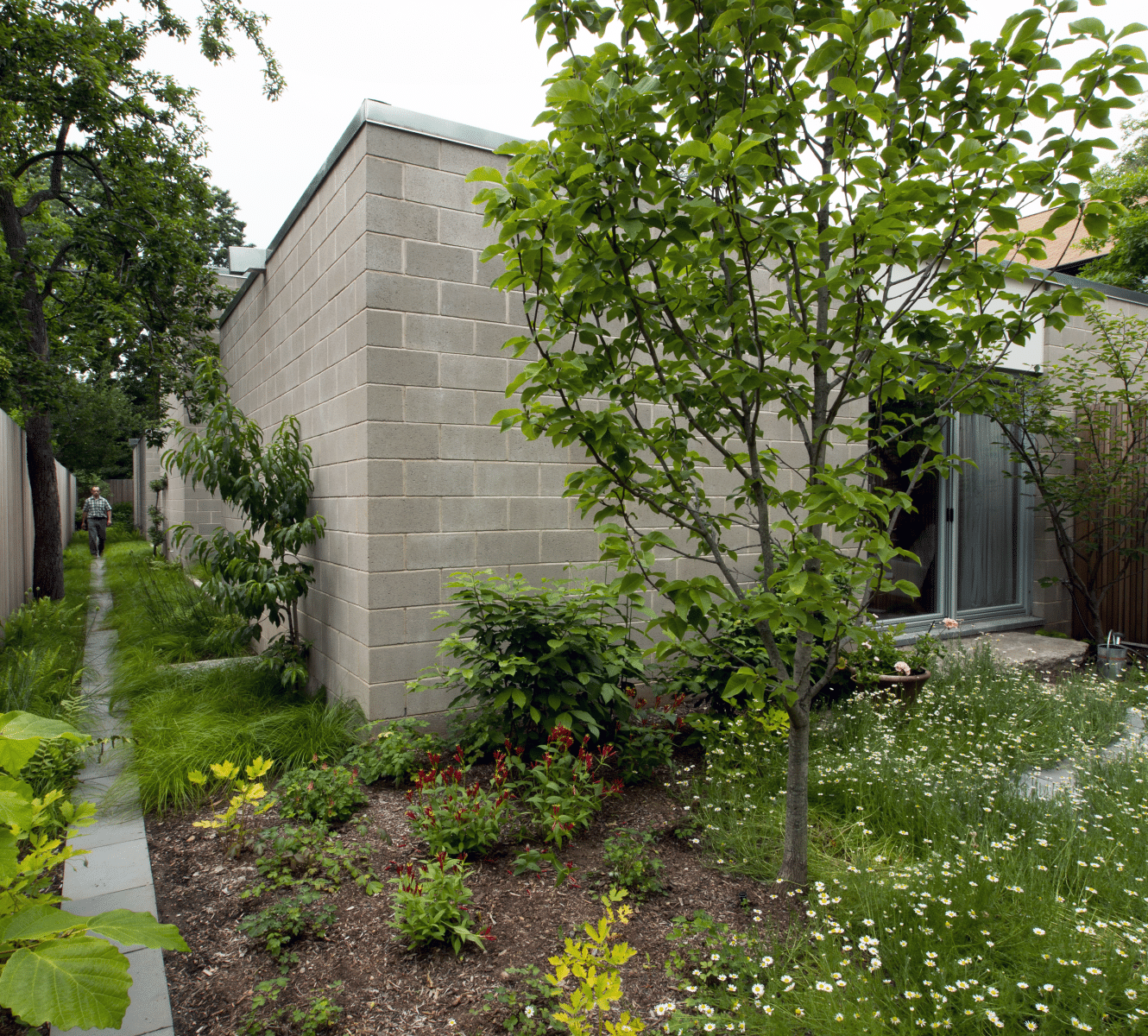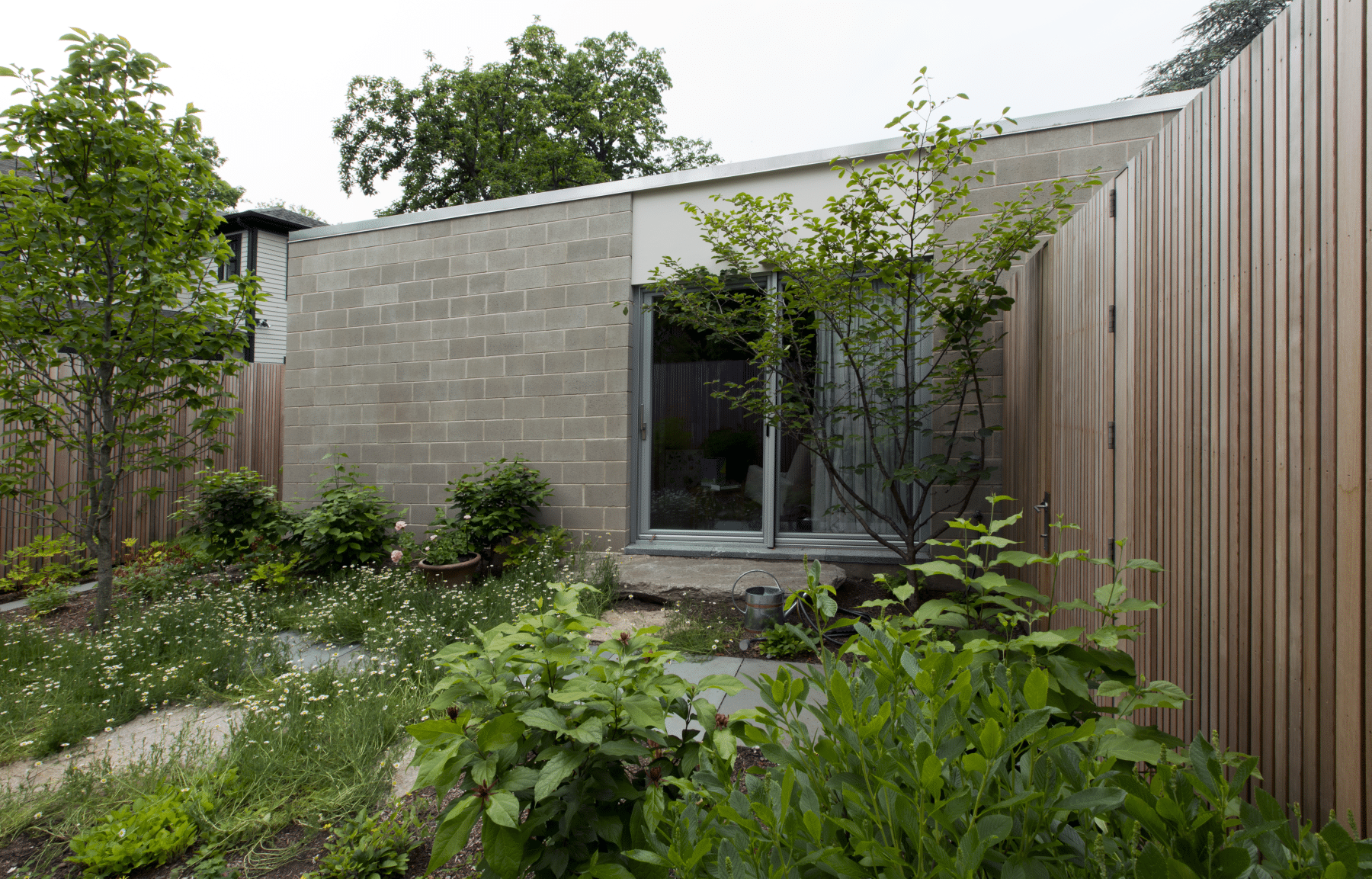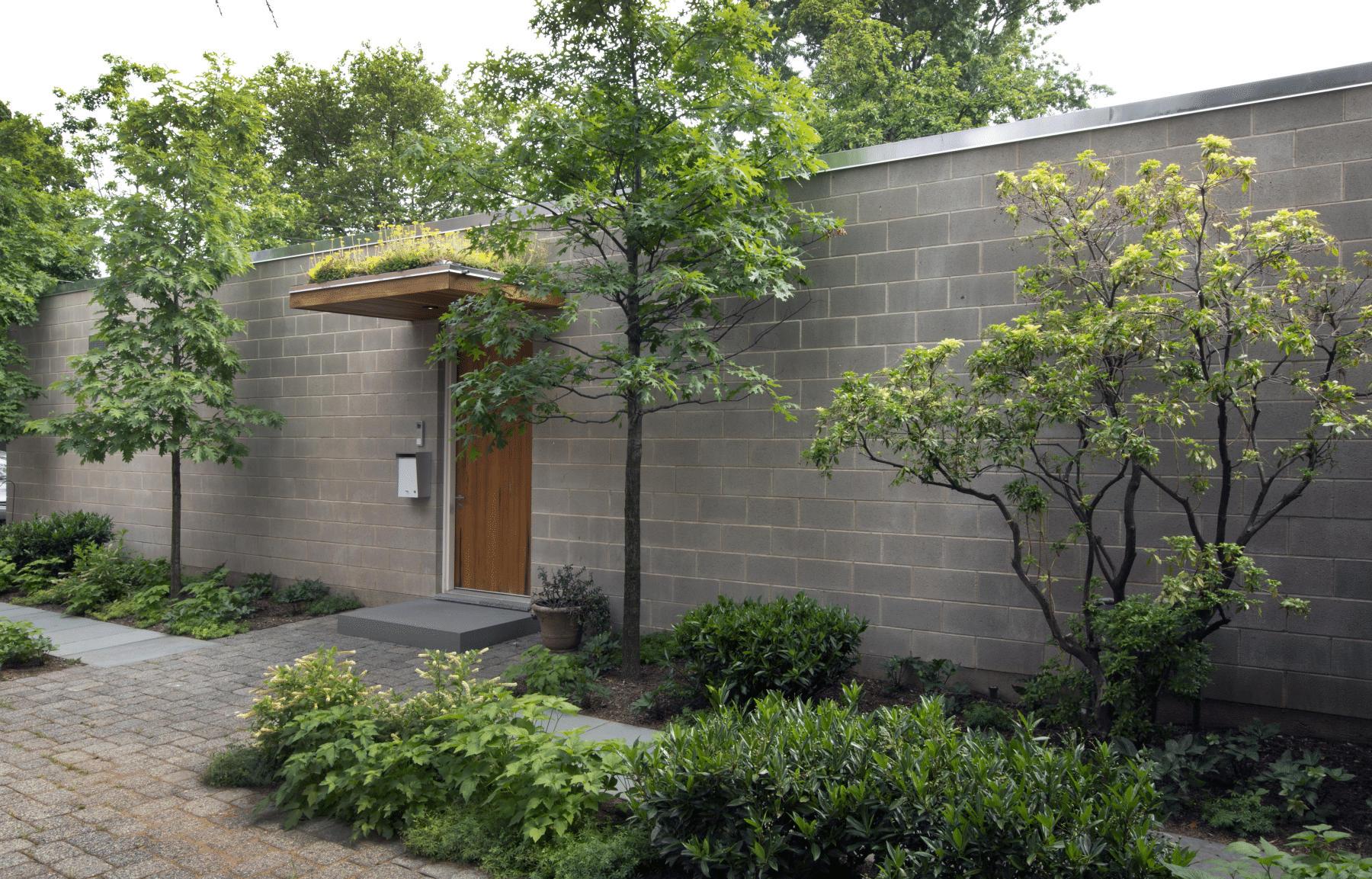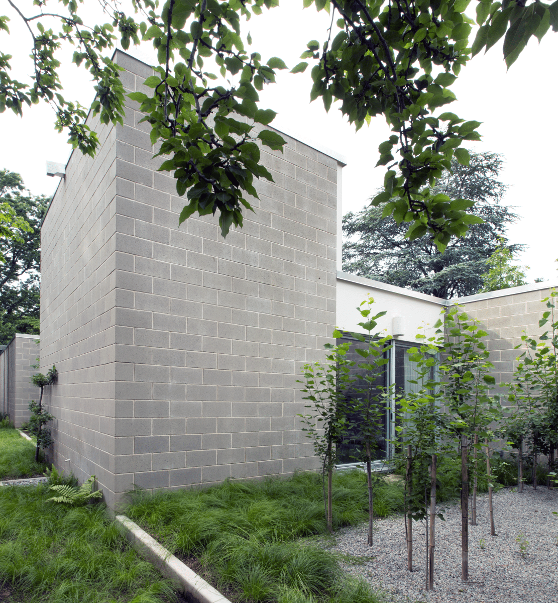 Particular aspects of the design solution included wrapping the CMU enclosure with 4″ of high-R polyisocyanurate insulation with a facing of 4″ CMU to match both the original surface, and the 8″ block module. The insulation was continued below grade to the footing – and a concrete grade beam was poured with sawn wood forming to replicate the visual presence of the original slab-edge. The enclosure enhancement included a tested air tightness at the Passive House standard – such that a single multi-point, air-sourced heat pump can satisfy the load.