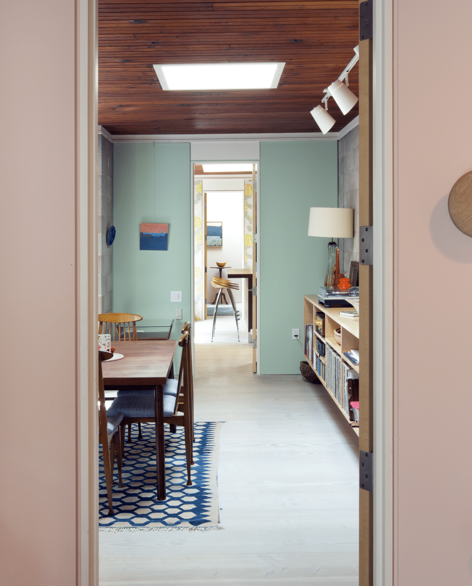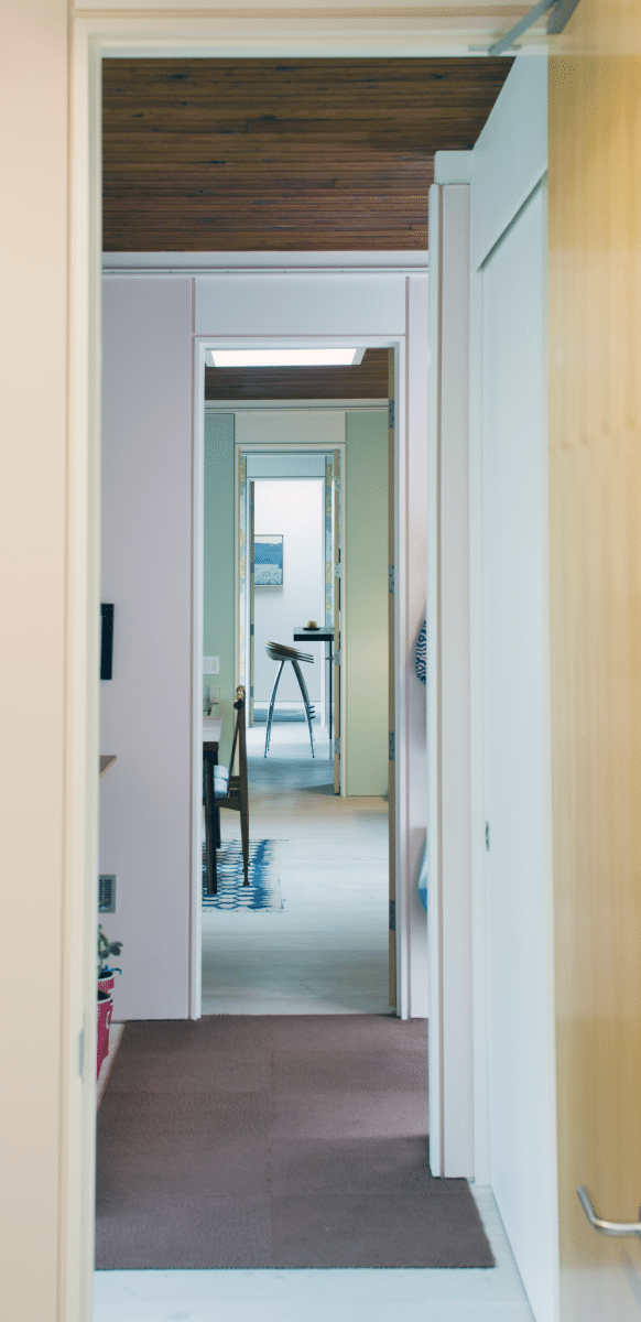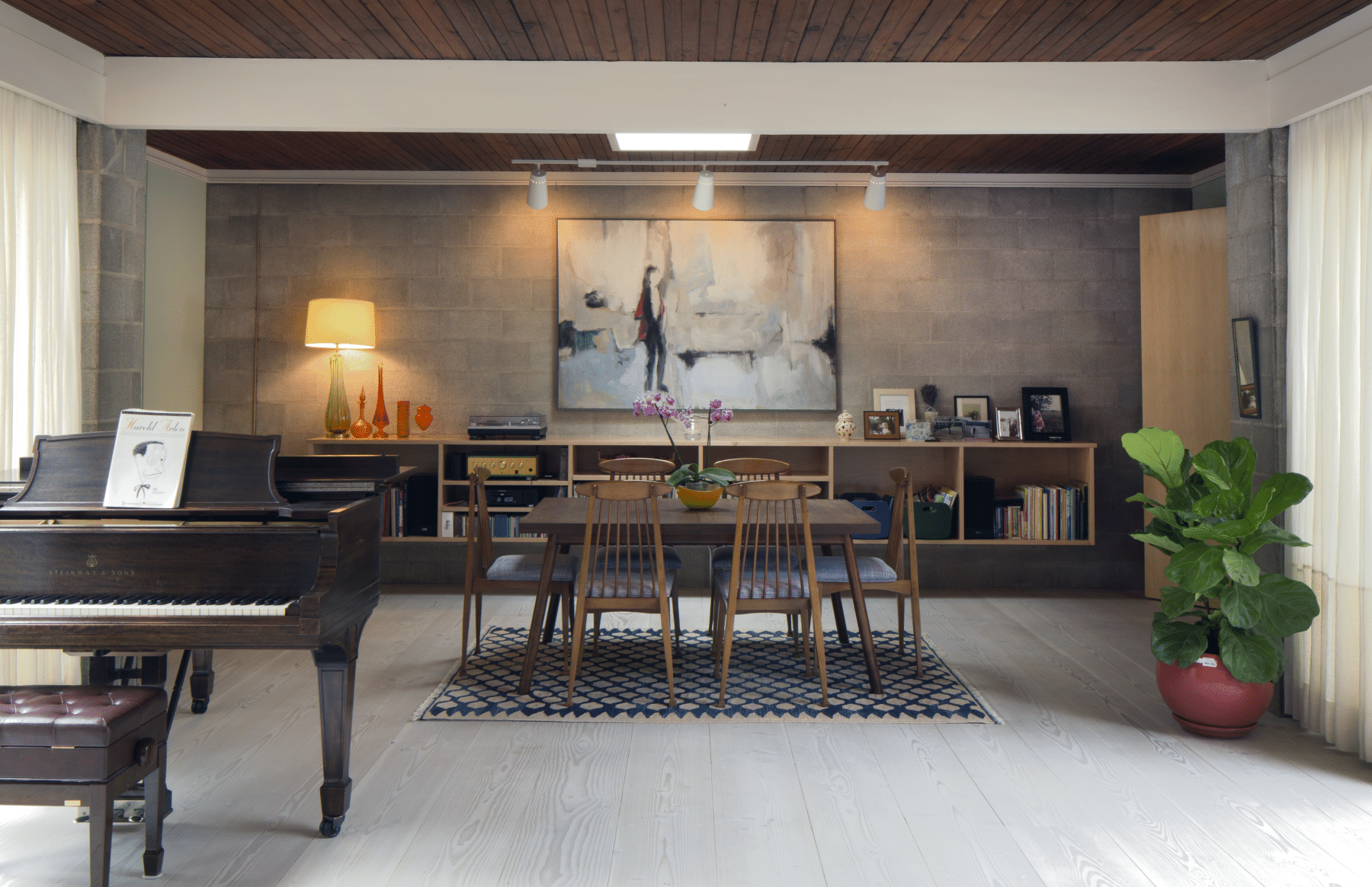 The Chermayeffs sold the building shortly after its completion in 1964. The new owners made some “improvements” over the years. Our design challenge was to achieve the required program, and some major remediations – including some structural loading reconfiguration to resolve insufficiencies dating from the original design – and produce a result that looked as though Chermayeff, chastened by present realities, had returned. The decision to retain the basic form precluded addition, so a careful rearrangement of the interior space, particularly the bedroom wings, was undertaken. The new requirements for an en-suite bathroom and a small home office space forced the reconfiguration, and although every original partition was removed, the final rearrangement bears a strong resemblance to the original layout.