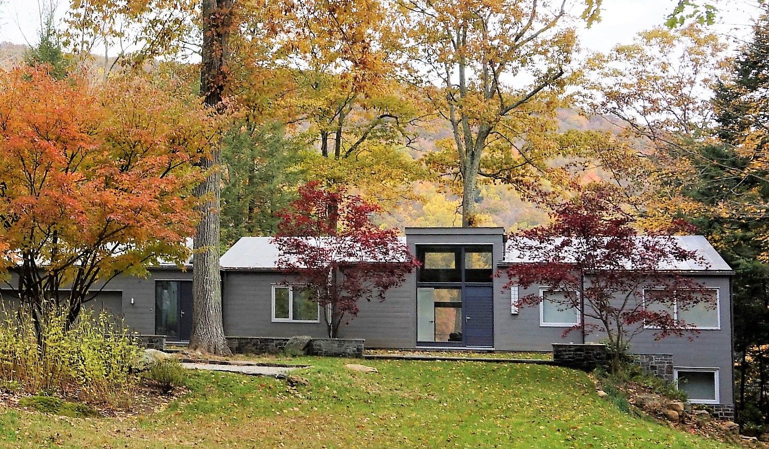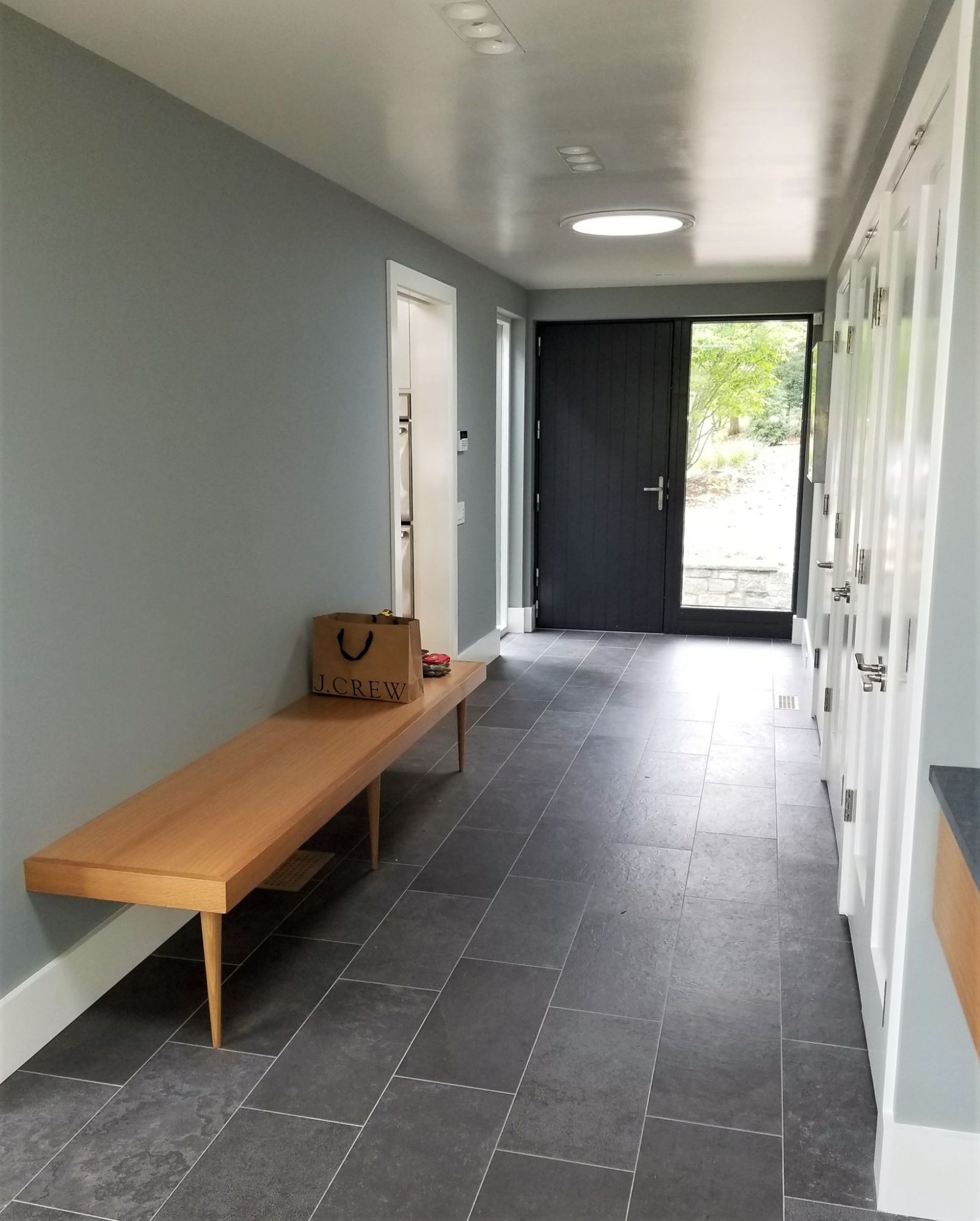 • New roof framed mostly with large hemlock timbers covered with 6” SIP panels (structural insulated panel). Remaining roof area is a stick-framed flat roof with tapered polyisocyanurate above the sheathing and 10” dense packed cellulose (R48) between the rafters