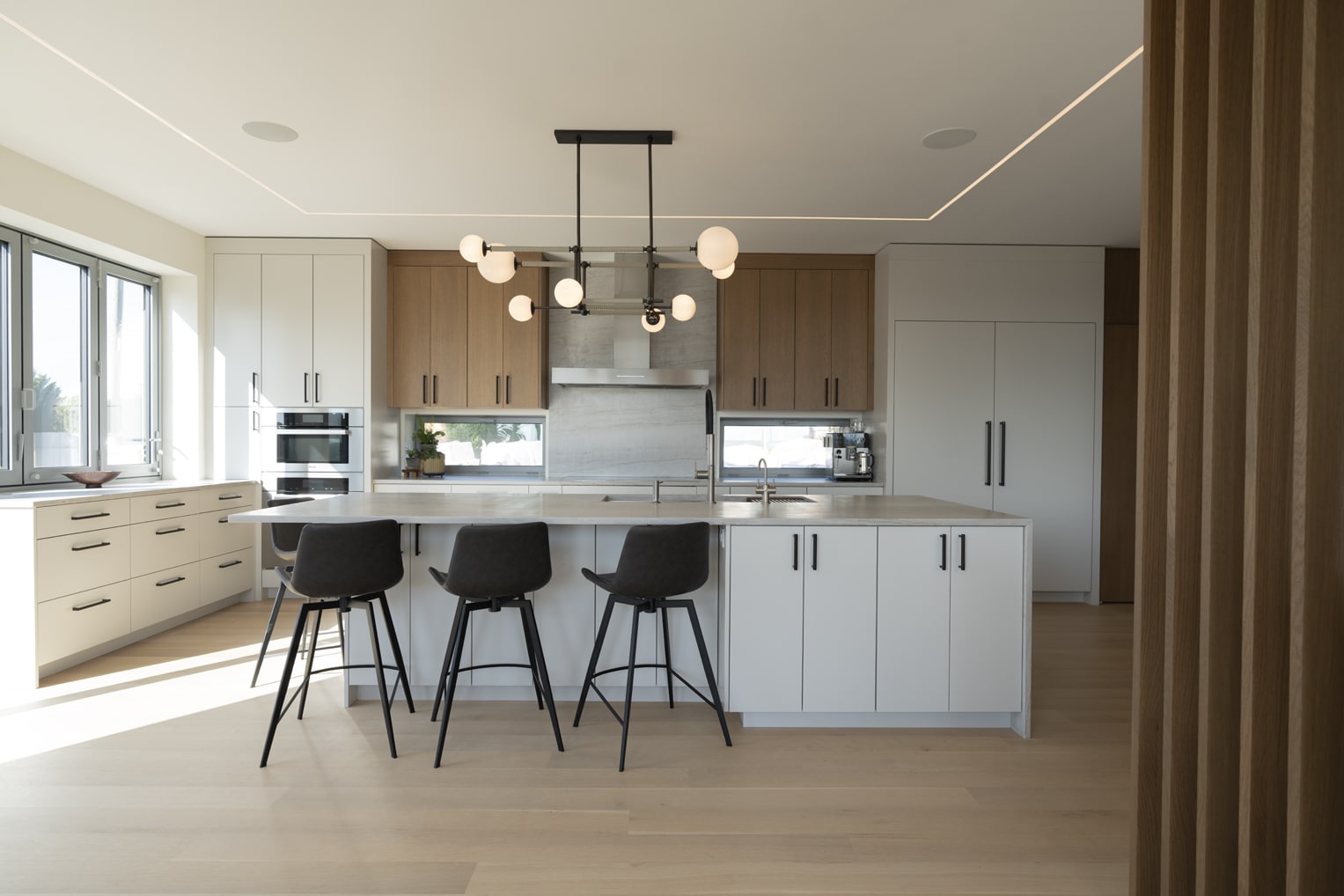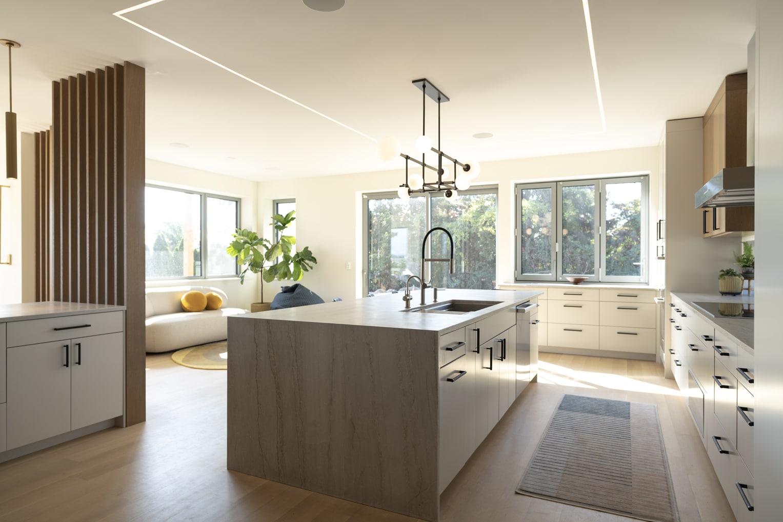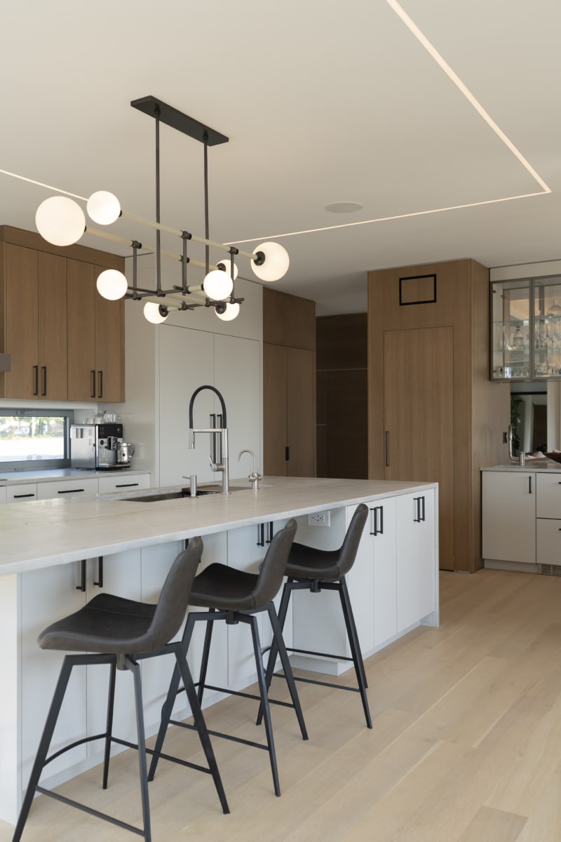 • Contemporary kitchen with European flush cabinetry, waterfall quartzite counters, and LED linear lighting integrated into the ceiling