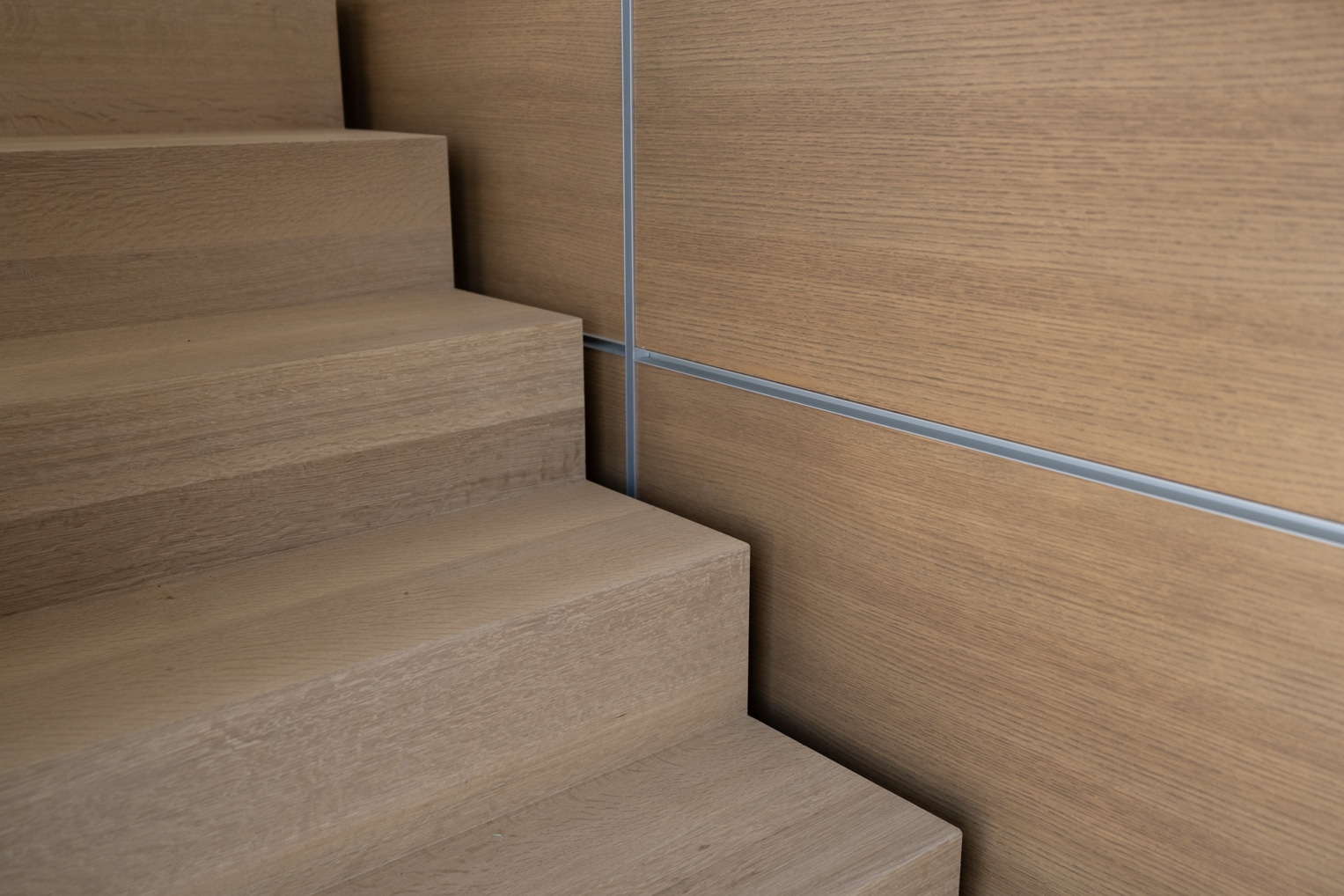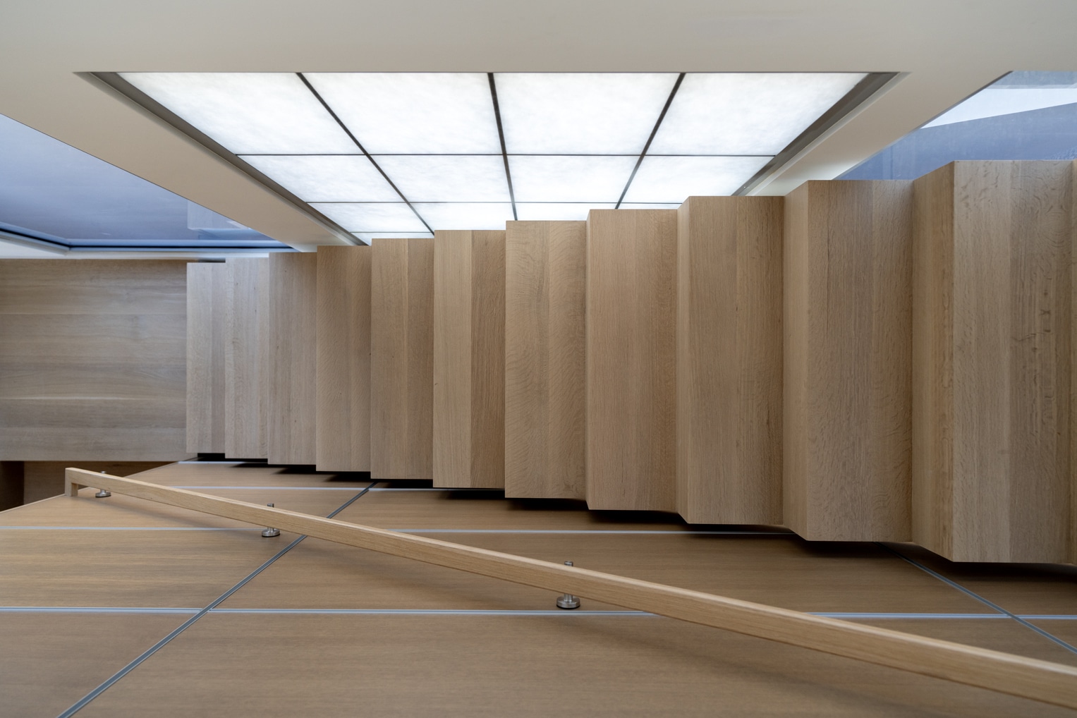 • Floating waterfall stairwell featuring large expanse of Kalwall glazing blocks that allow diffuse light to pass through but preserve privacy and insulate better than glass.