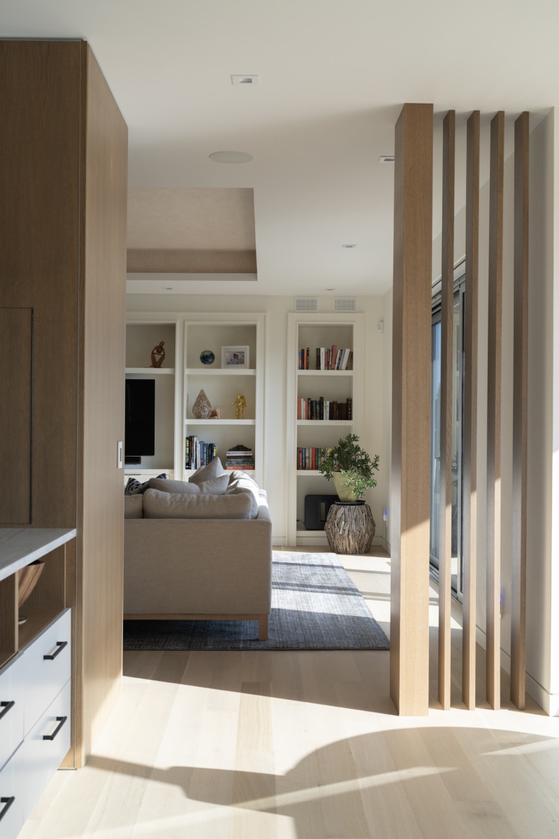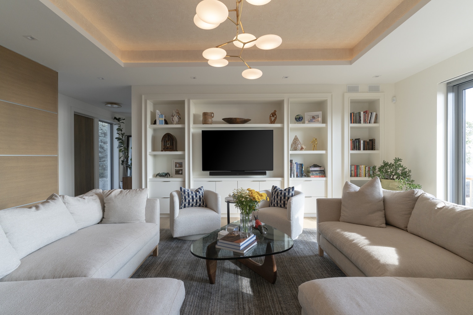 • Tray ceiling, built-in cabinetry, and triple sliding doors in the living room.
